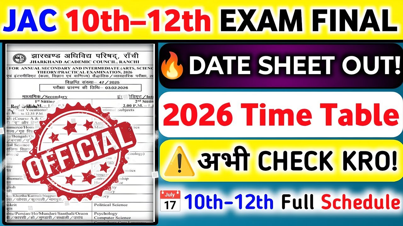 JAC Board Exam 2026 Final Time Table : झारखंड के लाखों छात्रों के लिए बड़ी खबर है। झारखंड एकेडमिक काउंसिल (JAC), रांची ने आखिरकार ...
